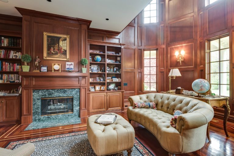The 2-story center hall foyer exhibits superb style and craftsmanship in the elegant moldings, gleaming inlaid marble floors, and exquisite floating staircase with filigree balustrade. The foyer opens to the stunning living room, awash with sunlight, and to the formal dining room. A butler’s pantry leads to the spectacular cook’s French country kitchen. This fabulous Susan Serra designed kitchen boasts extensive marble-topped custom cabinetry, separate integrated refrigerator and freezer, large professional gas stove, and an immense center island with farm sink. A walk-in pantry, archway to the family room, has radiant heated antique floors flowing into the sunny breakfast area with fireplace. The expansive family room enjoys sun-splashed views of property through 3 sets of arched French doors opening to the delightful rear veranda. The impressive library features a 2-story wall of windows, cherry fielded paneling, custom bookcases and a cozy marble gas fireplace. A service area accessing the garage includes a full bath, maid’s room and laundry.